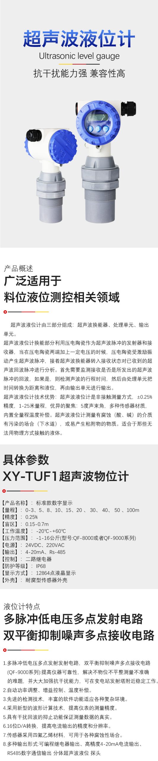 XY-GA鑄鋁型超聲波物(液)位儀,是我司根據多年應用經驗開發、制造的通用型超聲波物位計。它博采眾長,吸取了國內外多種物位儀優點。實現了全數字化、人性化設計理念, 成為我司升級換代的高端產品。外殼采用鑄鋁防水外殼、采用國際通用的電器接口。標準的接線端子,便于施工安裝;透明觀察窗口,更方便的物位數據觀察。具有完善的物/液位測控、數據傳輸和人機交流功能。主芯片采用進口工業級單片機、數字溫度補償和超寬電壓輸入穩壓等數十塊相關專用集成電路。具有抗干擾性強、可任意設置上下限節點、在線輸出調節、帶有現場顯示??蛇x擇模擬量,開關量及RS485輸出,方便的與相關設施接口。它具有高可靠。無污染。性能穩定。不必接觸工業介質就能滿足大部分液位、料位測量要求。徹底解決了壓力式、電容式、浮子式等傳統測量方式帶來的纏繞、堵塞、泄露、介質腐蝕、維護不便等缺點。因此可廣泛應用于與料位,液位測控相關的各個領域。本產品經國家權威機構檢驗認可,本產品符合GB3836.1-2010和GB3836.4-20010國家標準要求,防爆標志為:ExiaIIBT4Gb。
