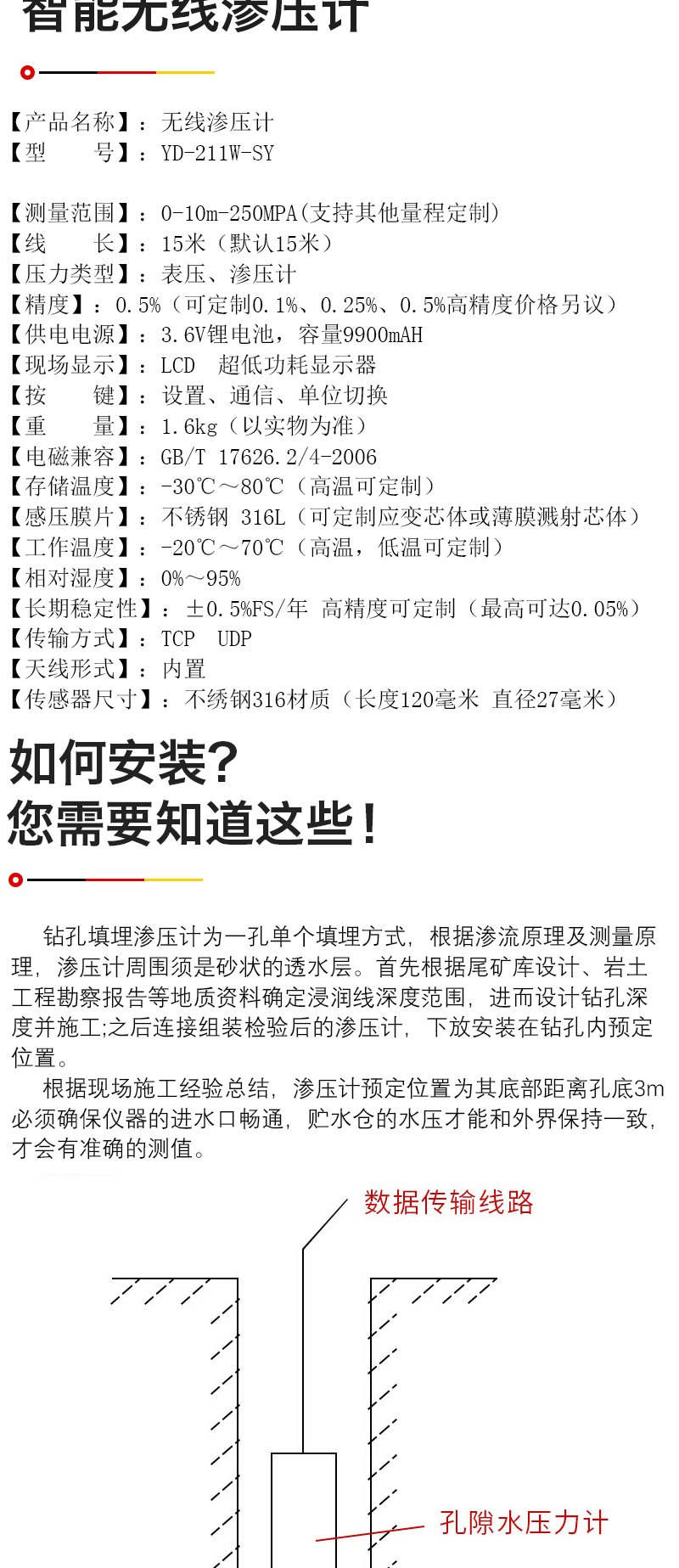 YD-223WA2 系列壓力計均采用擴散硅傳感器,可用于滲透壓力、孔隙水壓力、揚壓力、管道壓力等壓力監測,因此也稱作滲壓計、孔隙水壓力計或揚壓力計等 YD-223WA2 系列滲壓計廣泛使用于水利水電工程、堤壩、交通等行業的鉆孔、管道和壓力容器等壓力監測。滲壓計的主要部件均用不銹鋼材料制造,適合各種淡水介質下使用。